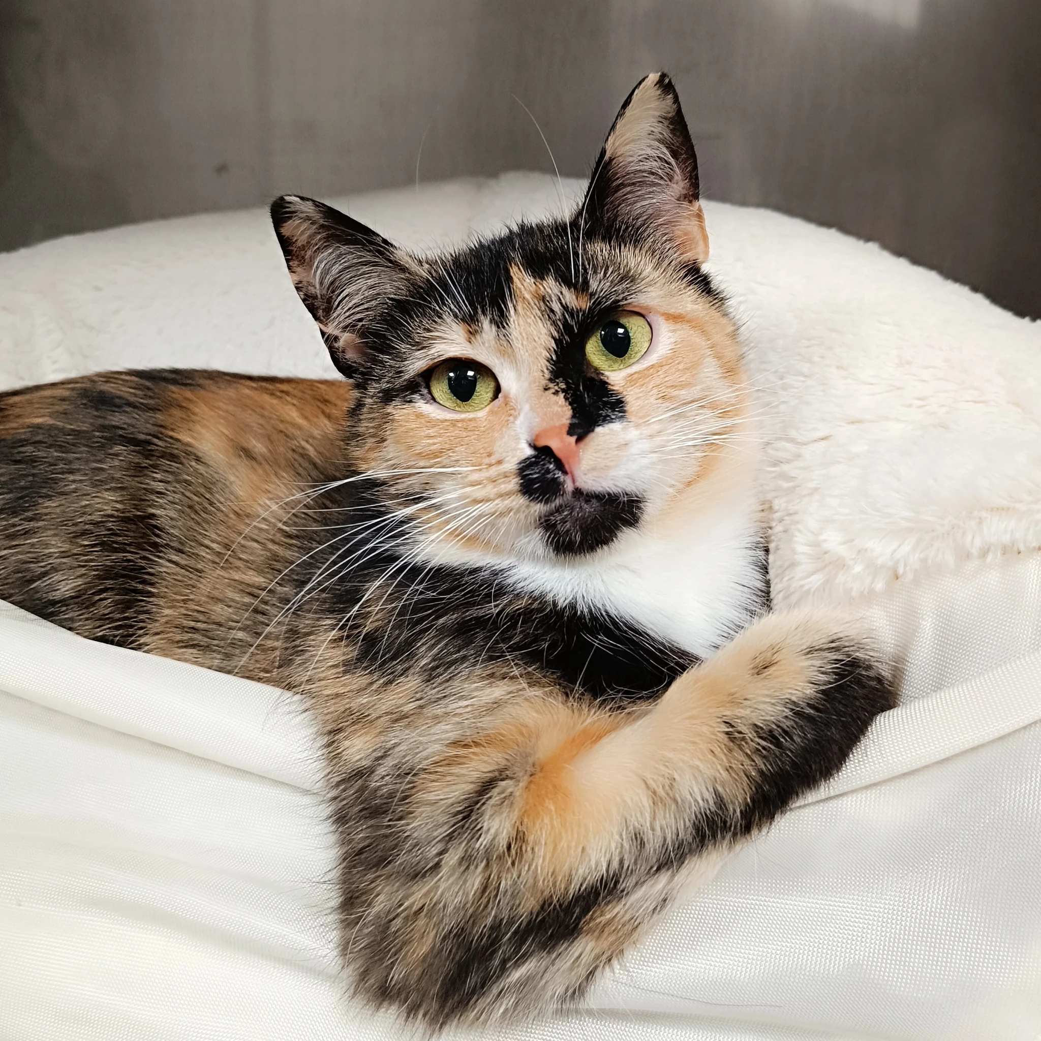 Melaia on noor kolmevärviline kass, kelle karv on valge, musta ja oranži kirju. Ta on väga ettevaatlik ja võõraste suhtes pelglik – uute inimeste eest poeb ta peitu. Kui aga inimene suudab tema usalduse võita, võib Melaia muutuda hellaks ja uudishimulikuks kaaslaseks. Ta armastab vaikses nurgas vaadelda, kuulata ja rahulikult nurruda. Melaia otsib rahulikku kodu, kus teda mõistetakse ja kus tal on aega harjuda omas tempos.