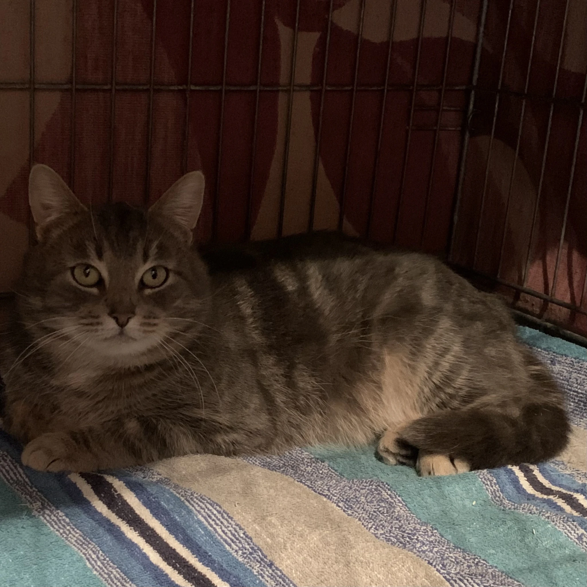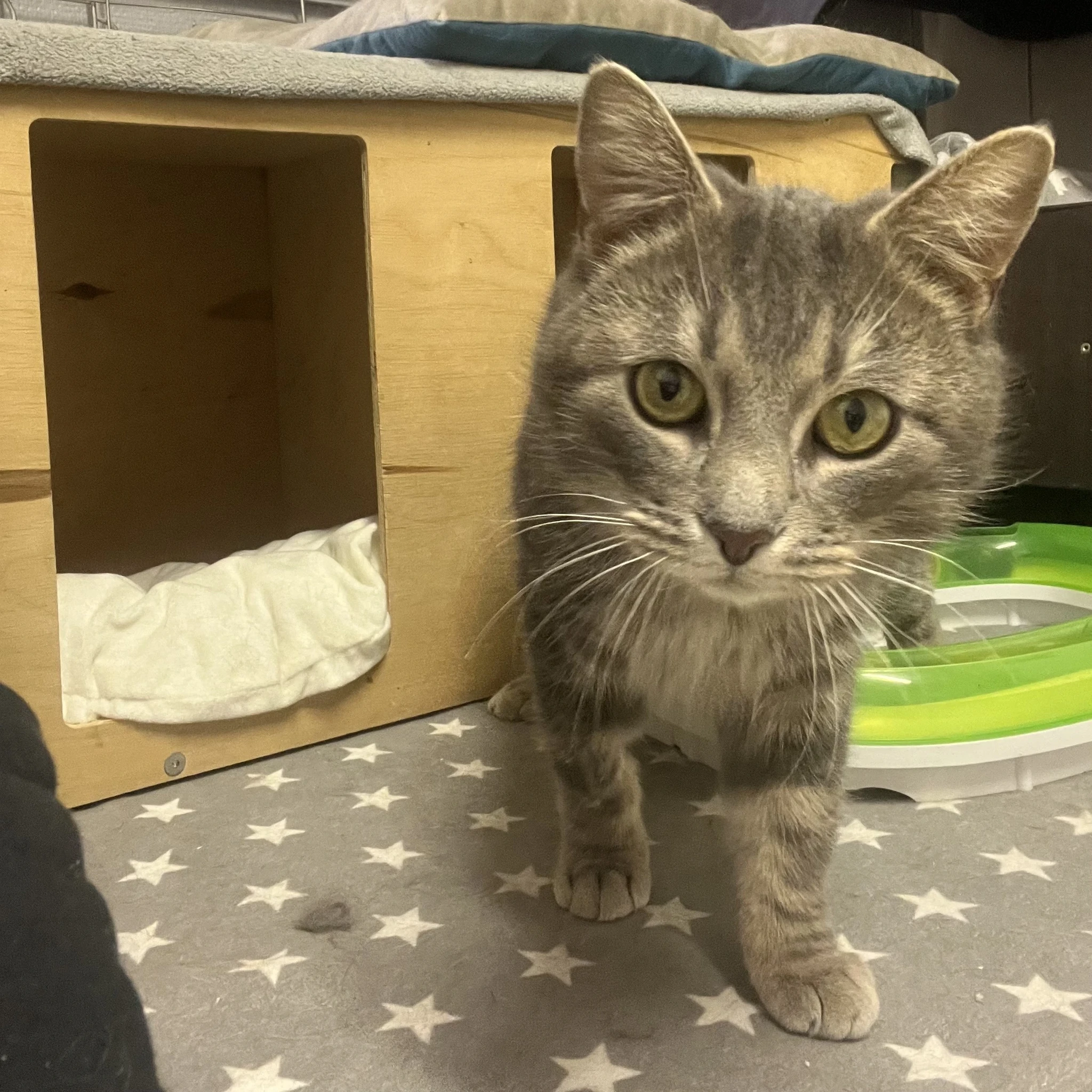 Kartlikult vaatas ta meid läbi puuri ja ei julgenud end liigutada. Kangestunult oli ta justkui puuri naelutatud. Puudutuste peale ta ei reageerinud ja üritas meid vältida. Mõned kähinad tulid küll kuuldavale, kuid mitte midagi väga hirmsat. Tegime esmase ülevaatuse ja toimetasime ta puuri puhkama. Puhkamise asemel asus ta kohe isukalt sööma. Kõhu mõnusalt täis puginud puges ta peitu. Oli näha, et ta ei soovi veel meiega suhelda ja vajab kohanemisel aega.